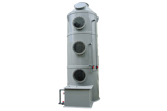 PPs洗滌塔結構:洗滌塔由除霧層、噴淋層、填料層、風機、風管、塔體、供水箱、供水泵等部分組成。洗滌塔系統的風機組將收集到的廢氣吸入酸霧PPs阻燃洗滌塔內,流經填料層段(氣/液接觸反應介質),讓廢氣與填充物表面流動的藥液(洗滌液)充分接觸,以吸附廢氣中所含的酸性或堿性污物,廢氣經過洗滌后,達標排放。